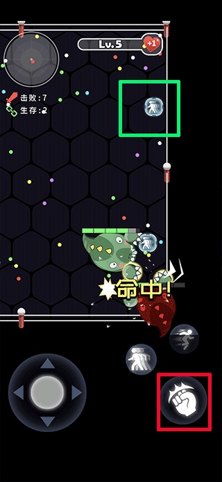 2、进游戏后红色方框内的按钮是攻击,地上经常散落着的是瞬移道具(比如绿色方框内的道具),记得捡起来;