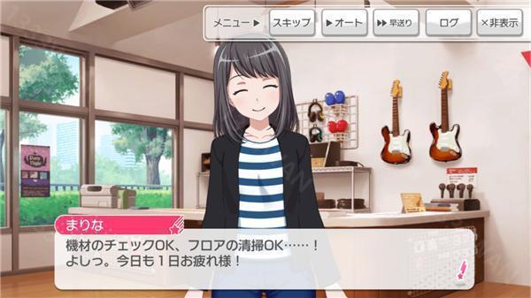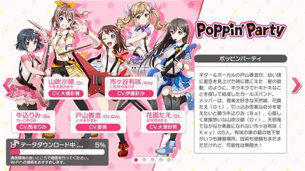 下载完毕后会有一小段剧情,内容是Poppin'Party 各成员的自我介绍,右上角的「メニュー(菜单)」按钮点下去后会有「スキップ(跳过)」、「オート(自动)」、「早送り(快进)」、「ログ(记录)」和「非表示(隐藏UI)」五个选项,就和其他的视觉小说类游戏一样。