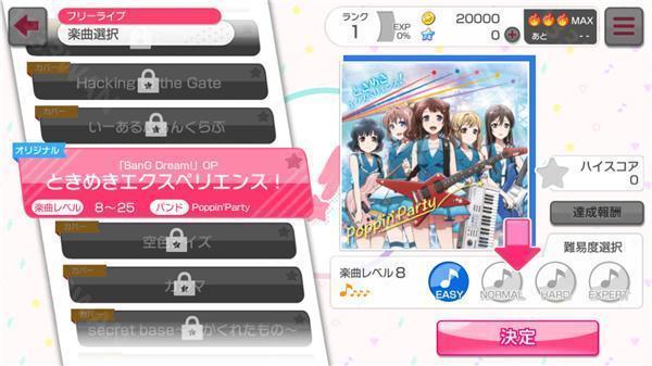 随即来到LIVE 部分,新手教学时只能打本家曲「ときめきエクスペリエンス」的其中一节,但是难度可以自选,Easy最简单,Expert最难。顺带一提,GBP 的LIVE 是非体力制的,只要想打就能随时开打,唯一会消耗的就只有画面右上方的火焰(LIVE BOOST,每三十分钟回覆一个,每一次LIVE 皆会自动消耗一个,发动后在LIVE 中获得的金币、经验值、报酬为平常五倍)。