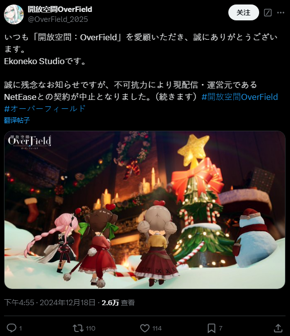 Ekoneko Studio 于2024年12月18日宣布,由于与发行商网易游戏的合约终止,微缩世界探索 RPG《开放空间:Over Field》即将于 2025 年 2 月 17 日终止服务。终止服务后,游戏将改由 Ekoneko Studio 负责营运,并于未来重启服务。