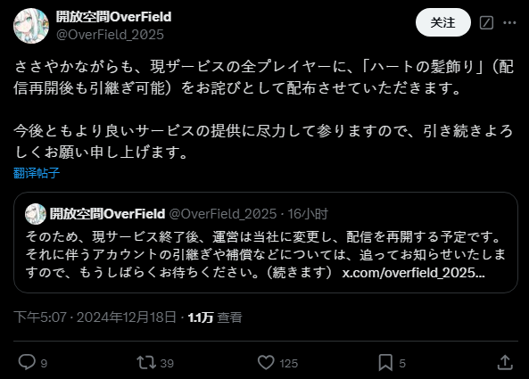 根据官方 X 帐号公布的终止服务通知,游戏内的预付式支付载具(晶石)现已无法购买,未使用完毕的晶石(限付费),可于终止服务后的2025 年 2 月 17 日至 5 月 27 日之间申请退费。此外,为了表达歉意,官方宣布发放「红心发饰」(可在重启服务后继承)给所有玩家。