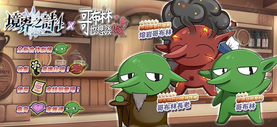 《哥布林也想谈恋爱》中透过採花以及特训来提升哥布林的经验并进化后向不同的女冒险者展开追求,意外穿越来到《境界之诗 Tactics》的哥布林与哥布林长老,即将面对各种喜好不一的女冒险者,甚至将面临残酷的「芋头火锅」心灵考验──通关后可获得魔晶石等珍贵物资外,还可以享受《境界之诗 Tactics》×《哥布林也想谈恋爱》破万字的原创故事!