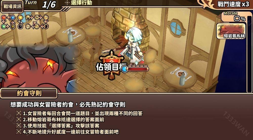 「与女性冒险者的约会练习」关卡中玩家可以看到左右两边显示数字,女冒险者将会提出问题,玩家需要根据自己想选择的答案、将「熔岩哥布林」移动到「左边答案 (数字)」或「右边答案 (数字)」,记得要使用技能「选择答案」攻击该答案 (数字),玩家也可以点选左边 / 右边数字并查看「被动」观看该数字的回应。小提醒:第一回合要走到数字「1」的前面、第二回合要走到数字「2」的前面,以此类推!