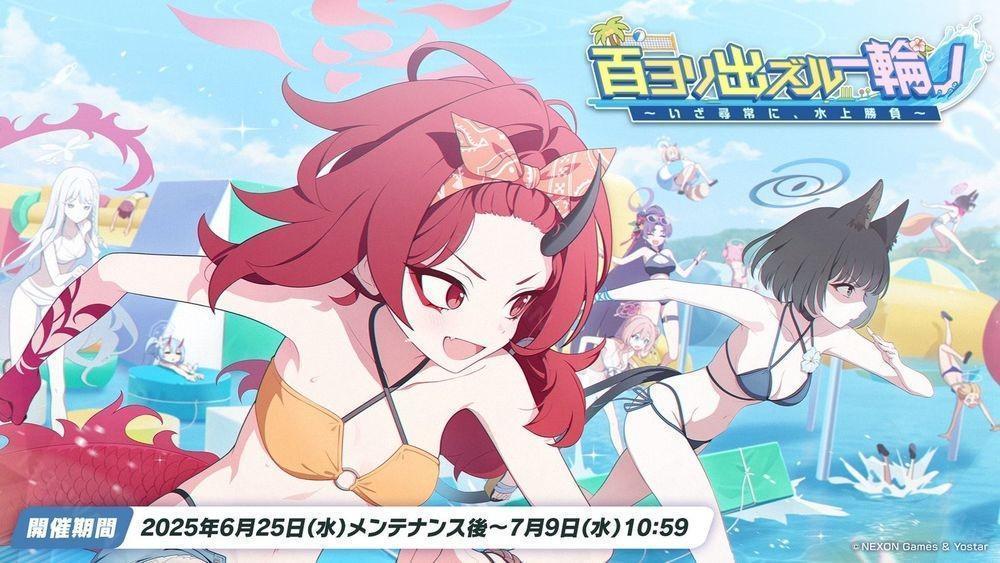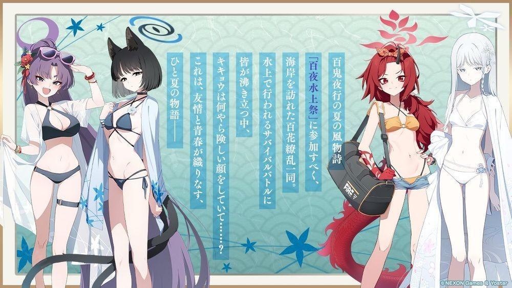 Yostar 宣布,手游《蔚蓝档案》日服将于 6 月 25 日(三)维护后举办全新活动剧情「百里出一花一朵~水上对决,一决胜负~(暂译,百ヨリ出ズル一轮ノ~いざ寻常に、水上胜负~)」,★3「紫(泳装)」、★3「桔梗(泳装)」、★2「莲华(泳装)」的特选招募也将同时登场。