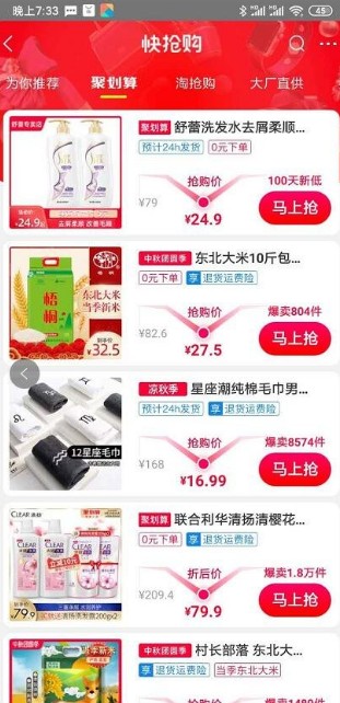 2、我们点击手机天猫首页的“快抢购”,进入快抢购的活动会场,我们可以看到上面的导航栏有为你推荐、聚划算、还抢购、大厂直供。我们点击聚划算进入,聚划算页面,聚划算的这个活动版块都是0元下单的商品。
