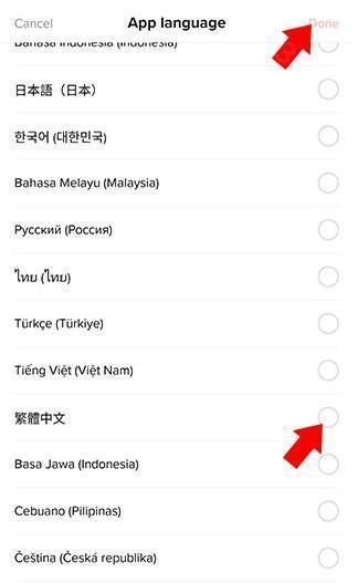 4、第四步:在【APP Language】栏目下找到中文选项,选中后点击右上角的【done】。
