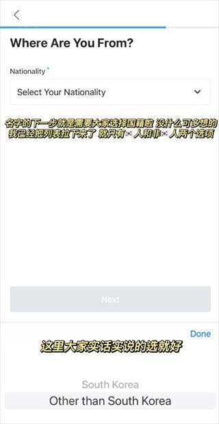 7、名字的下一步就是需要大家选择国籍啦,没什么可多想的,列表拉下拉就只有韩国人和非韩国人两个选项