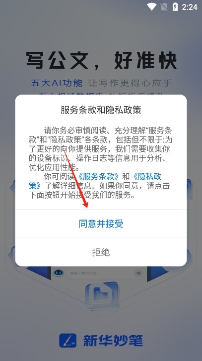 2、进入后阅读并同意新华妙笔app的用户协议