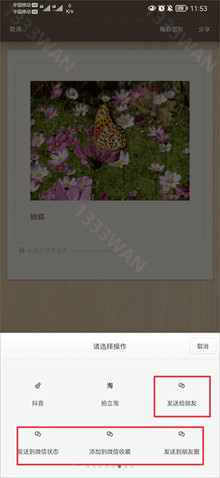 3、最后点击右上角分享,并在下方选择发送给微信朋友、朋友圈、收藏等即可