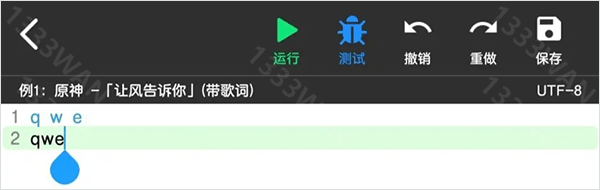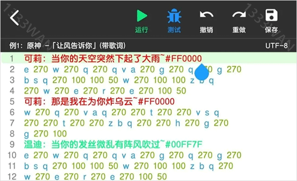 菜菜音乐盒提供了两种弹琴脚本测试方法,“ 运行 ”是指播放全部脚本,“ 测试 ”为播放左边序号有蓝色标记的一行或者多行脚本